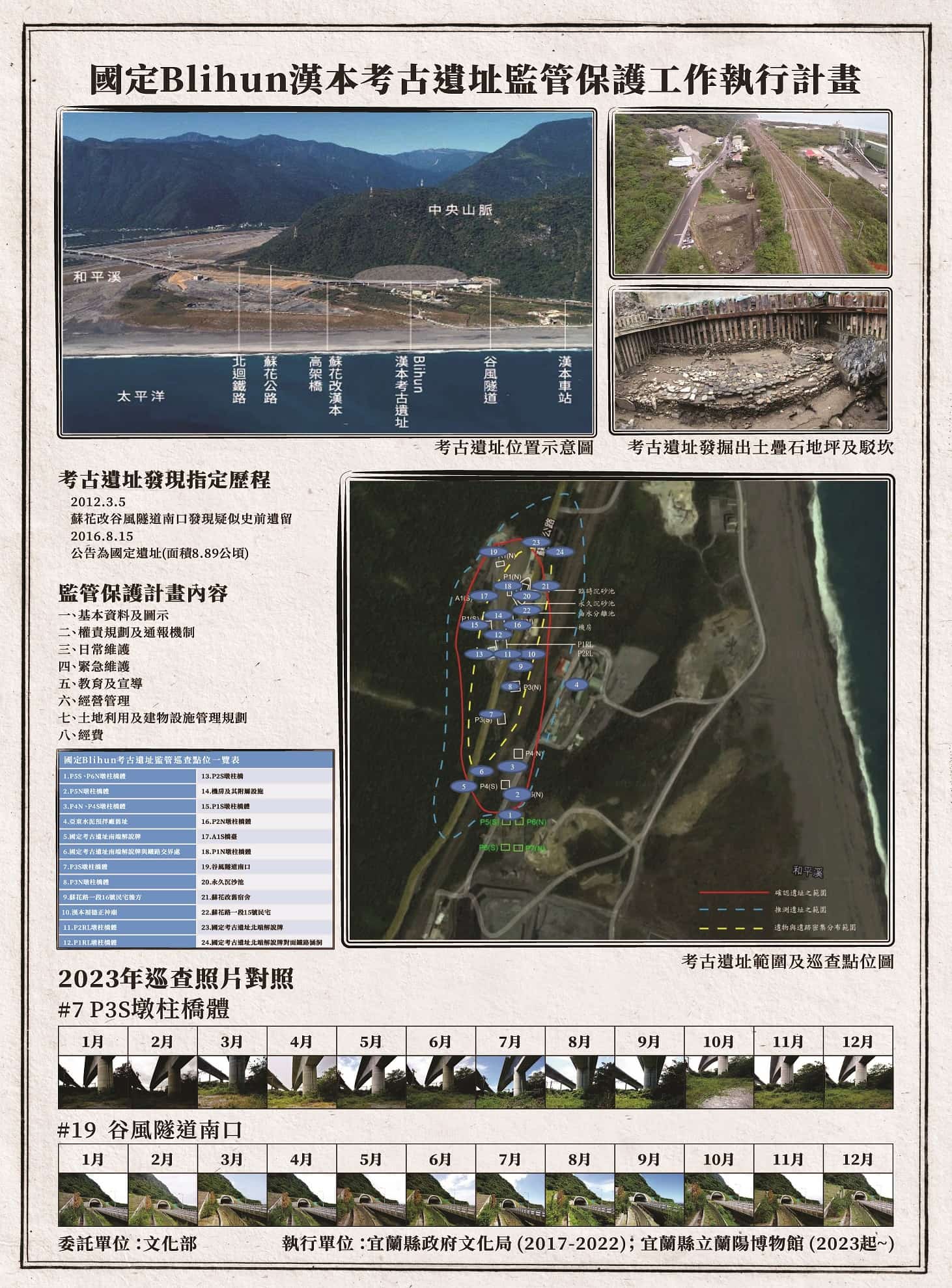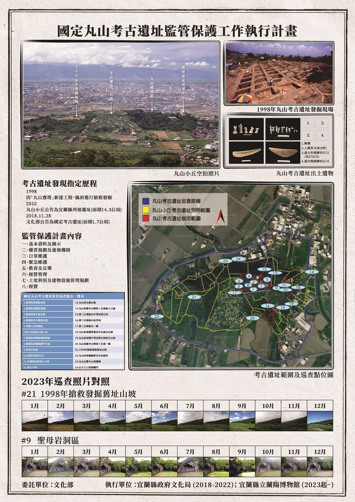 文化部至2023年底已指定全國共11處國定考古遺址,其中宜蘭縣境內有兩處,分別為位於南澳鄉澳花村的Blihun漢本考古遺址以及冬山鄉丸山村的丸山考古遺址[1]。蘭陽博物館(以下簡稱「蘭博」)自2023年1月1日開始執行宜蘭兩處國定考古遺址監管保護計畫,在屆滿1週年之時,透過本文以《文化資產保存法》及相關法規[2]的考古遺址保護手段為題,說明如何藉由「發現、指定與監管」的過程,逹到保全維護考古遺址之目的。