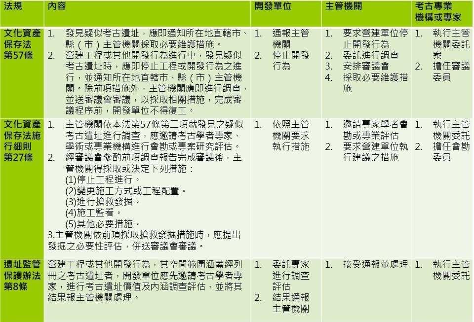 [2] 相關法規除《文化資產保存法》(簡稱《文資法》)外,尚有:《文化資產保存法施行細則》(簡稱《文資細則》)、《考古遺址監管保護辦法》(簡稱《監管辦法》)、《考古遺址指定及廢止審查辦法》(簡稱《指定辦法》)等。