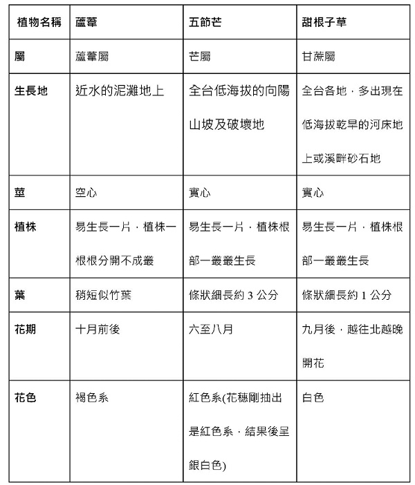 一朵芒花無艷色、無可愛花語,看起來不嬌豔也無可欣賞之處,但當整片占據在河床中的芒花盛開,其數大便是美,壯闊之姿則是令人難以移開目光。所謂的管芒花是一種芒草,但其實在相同的貧瘠環境條件之下,會有多種不同的植物共域,它們不僅形態相似,名稱也易於混淆:蘆花、葦花、芒花、荻花等,都來自於禾本科的大家族,若非對植物稍有辨識功力,不細看還以為都是同種。但雖然外觀相似,我們還是可以由一些簡單的生長方式、生長環境來推論為哪一種。以下針對常見的三種禾本科植物來介紹:蘆葦、五節芒、甜根子草。