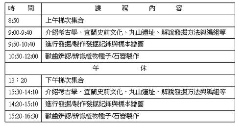 本活動內容包含考古學及宜蘭史前文化介紹、田野發掘體驗、認識考古遺物、考古文物製作操作等,希望透過各種實際的操作,讓國小學童學習到考古學家如何從事田野工作,回到實驗室後如何分析考古資料,接著如何建構考古詮釋。而另一方面,則希望透過石器製作的操作,讓同學可以想像史前人如何運用大自然的資源製作可以使用的工具,並透過這樣的過程,使其和史前人的生活有更深刻的連結。