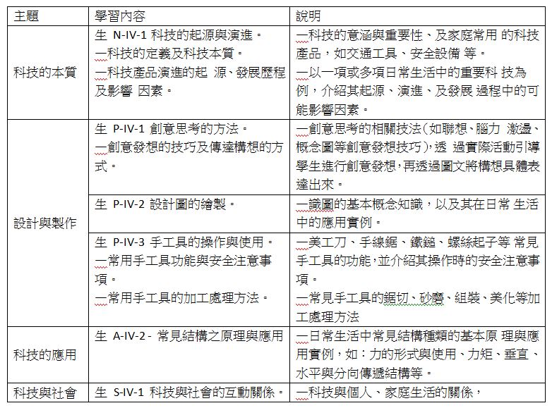 108課綱生活科技學習內容共分為四大主題,與七年級有關的學習內容如附件一。