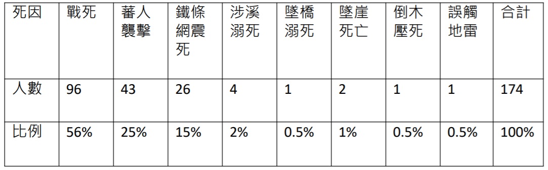 根據《台灣警察遺芳錄》加以整理,原屬宜蘭廳或於宜蘭廳境內蕃地殉職的警察共有174名(詳見附件表二:宜蘭廳蕃地殉職警察表〉 ,死因有戰死、涉溪溺死、墜橋溺死、蕃人襲擊、墜崖死亡、鐵條 網震死、倒木壓死、誤觸地雷等類別,其中鐵條網震死有 26 名,所佔比例為 15%。