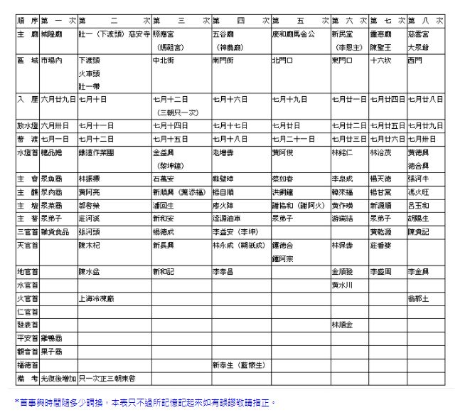 各地區擔當首事一覽付在下表。先將考究中元來歷,因想要端詳,請教宜蘭市故李清波先生(生前文力越群)令郎吳冬錫、吳舒揚兩昆仲及元老蕭阿呆先生惠賜寶貴資料在此申謝。