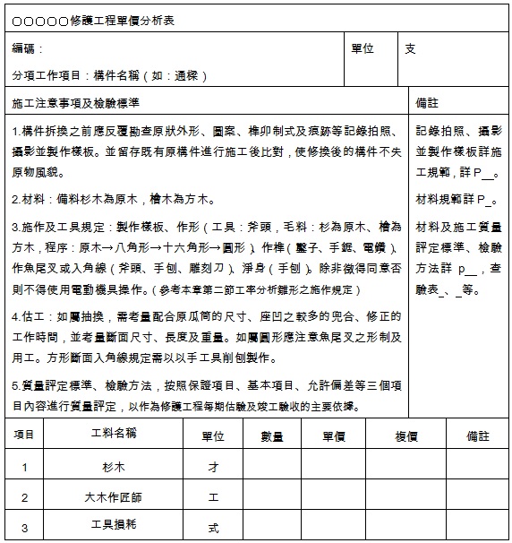 現行台灣傳統建築修護在材料、工具、匠師、工法、技術規範上並不足以規範修護品質的責任,相對於規範匠師使用傳統技術與方法便無法落實,為保證修護品質,本研究主張在傳統建築修護施作規範與約束上,應於修護招標的廠商投標估價單上,將大木構件施作主要的影響因素、現有的施工規範、質量檢驗評定標準等內容置入,並將構件施作在材料、工具、匠師、工法、技術的要求規範一併加以詳細說明,以作為落實修護品質施作的依據。傳統建築修護單價分析表(如檔案下載)。