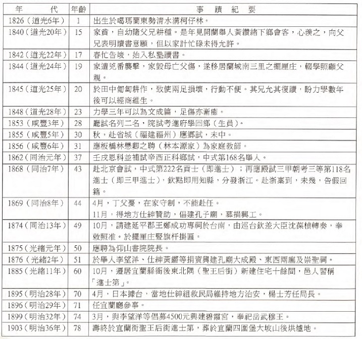 一個農夫之子,因緣造化,從28歲考中秀才起,一路過關斬將,在43歲高中進士,正是「名登兩榜開蘭僅見」,直到78歲去世的35年之間,他是宜蘭的首席仕紳。在世人眼中,楊士芳集富貴壽考於一身,但他晚年的詩作卻說「只願融融過此生」,這是因為他的晚年,無論家事或國事都讓他煩心不已。