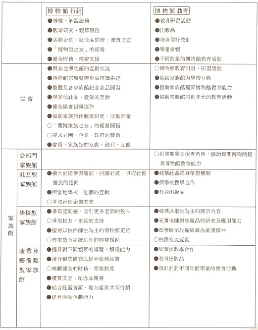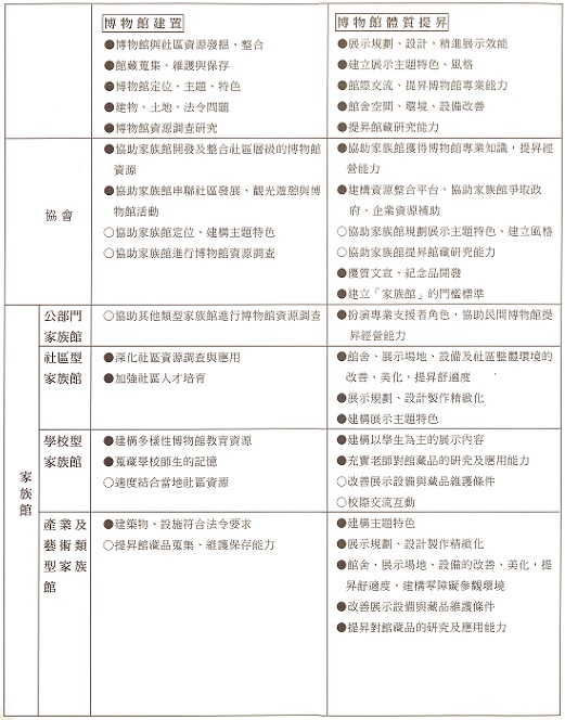 公部門的家族館有國家預算支持,人員、專業知識、設備都比較好,許多經驗可以支援其他家族館的學習成長;學校型的家族館仍以教學為重心,其條件和考量重點與社區型、產業型家族館大不相同。產業型家族館的規模都很小,事業經營平穩、有固定盈收的家族館,比較沒有博物館的經營壓力,他們需要的是提昇博物館專業,例如展示、導覽解說、典藏、教育活動等方面的服務品質;有的家族館人力單薄,原本的財務、事業體質就不佳,必須先設法穩住其事業經營的基本盤,才能再談其他的博物館工作。即使是社區型的家族館也各有不同的特性,有的發展社區產業已趨成熟、有的剛剛起步、有的並不以產業為社區博物館的重點,這些社區型家族館的共同的問題是缺乏自主的經費來源,每年靠申請政府的獎助來推動業務。大多數產業型、社區型家族館,最關心的莫過於政府的獎勵、補助措施;政府對於民間發展文化觀光事業,固然應該給予協助,但也不可能做到人人有獎、家家滿意,如同公費留學有一定的科類、門檻、名額限制,家族館必須先充實自己,做好考試的準備。要補助款像看天吃飯,農委會、文建會、經建會、營建署……計畫一大堆,寫來寫去,少有不暈頭轉向的,為了成為各本位主義政府部門眼中的「好學生」,以便補助款「金榜題名」,各種計畫削足適履,到最後寫的人、審的人都茫茫然﹙反正一切都亂中有序,大家也就在渾沌中長得眉清目秀﹚。這樣的情形,在公部門開始著手建構資源整合平台之後,將會逐漸獲得改善;相對的,各家族館擁有明確的目標、具體清晰的實踐步驟、以及較佳的執行能力,就變得十分重要。協會的功能角色,一方面在串聯各家族館作整體的行銷,而其根本,則是在前述的認知之下,協助家族館提昇體質、內涵和博物館專業。