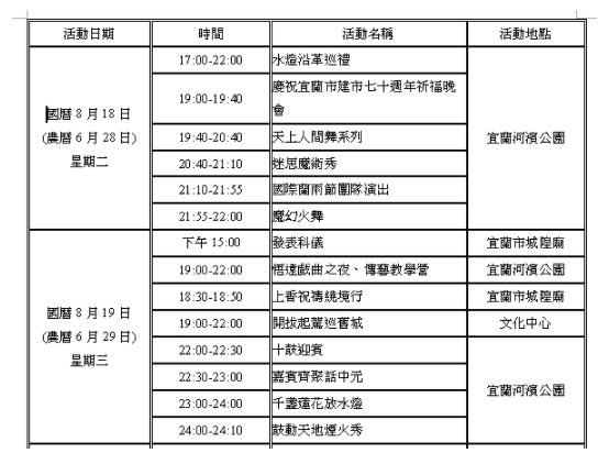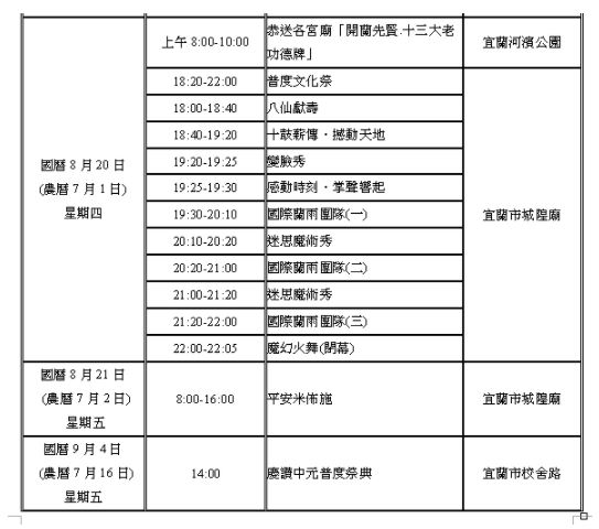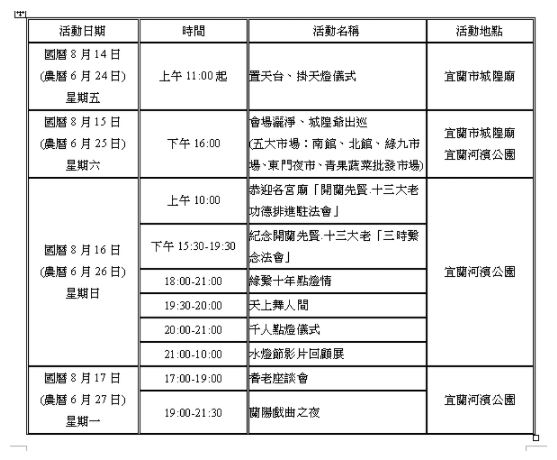 城隍廟的活動則是以宗教儀式為主,如置天台、掛天燈、會場灑淨、城隍爺出巡、發表科儀、上香祝禱繞境等。附件為2009年「宜蘭水燈節活動節目流程表」,整個中元普度的文化活動,自城隍廟的掛天燈儀式起,至農曆7月30日的謝天燈活動為止,展現出民俗宗教文化的新風貌,同時也劃上一完滿的句點。