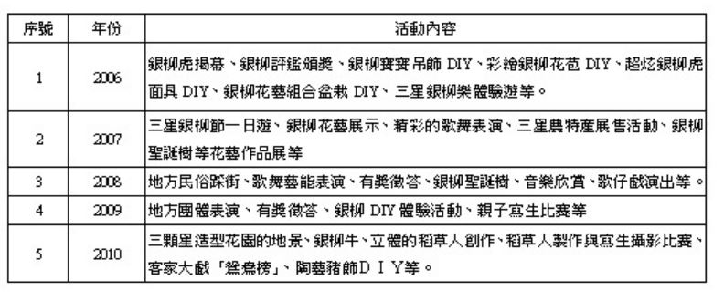基於資源有限及公平分配,三星農會從2004年開始轉以三星地區重要特色產業銀柳為主題推動行銷,希望能創造農民更多的經濟效益;不過三星鄉農會辦理各式產業文化活動,雖然主題不同,內容仍然是著重於整合其他重要作物及產業,如蔥、茶、上將梨、銀柳、休耕田地景觀營造、特色餐點、伴手禮及休閒農業體驗等等。(註2)