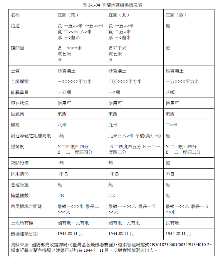 必須留意的是,檔案記載機場建築日期均為1944年11月與實際情形有出入,宜蘭(北)最初建造於1936年,宜蘭(南)則是起造於1944年1月份。