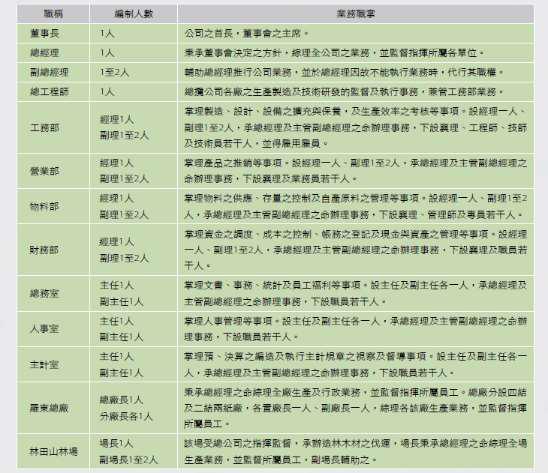 [8]「臺灣中興紙業股份有限公司組織規程草案」,《臺灣中興紙業公司檔案》檔號:0048/711-1/1/001/001,民國48年1月20日。(資料來源:戴寶村,《紙菁風華─臺灣產業經濟檔案數位典藏專題選輯─臺灣中興紙業公司,2008,頁39至40)。