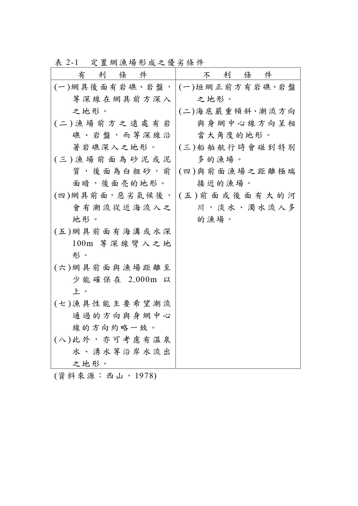 漁獲成績越好的漁場,其作業的歷史就越久,而且也證實魚道深受海底地形影響(西山,1978)。就海底地形而言,漁場最好是在岸邊有茂密的魚付林,底質為砂、礫、砂泥、泥,等深線密集,後面有魚礁或岩礁,潮流不強,附近勿有大河川出海口,各漁場距離在2000m以上,勿影響航道的場域(見附表2-1)。