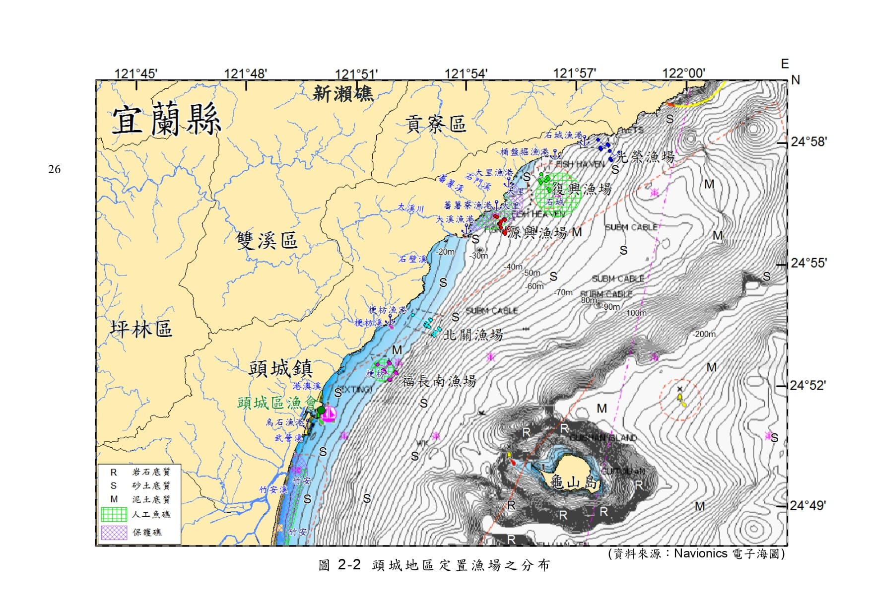 宜蘭縣全段海岸大致可分為:礁溪斷層、蘭陽平原及蘇花斷層等三種不同類型海岸[1],其中由頭城鎮石城里的大澳至外澳里的北港口,屬於礁溪斷層海岸,最北側石城漁港附近海岸屬礁岩地形,等深線密集,水深徒降;石城漁港至大溪漁港間水深10公尺內等深線較密,地形變化較大,10公尺外坡降相對較緩;大溪港口以南至梗枋漁港間,水深5公尺內等深線較密,5公尺以外坡降較緩;烏石漁港區段,緊鄰烏石港北側水深10公尺以內坡降相對平緩[2]。惟本地區因有多條溪流沖積土石至本區海域,使頭城地區沿岸海域底質皆屬砂質或硬泥為主,僅石城及梗枋少數為岩盤及部分土石地形[3](見附圖2-2)。