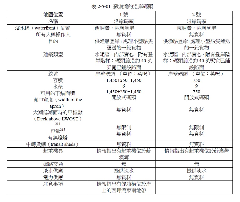 [5] 本小節:「參、美軍對蘇澳港之調查」,資料來源為:JANIS 87: Joint Army-Navy Intelligence Study of Formosa(Taiwan), “Port Facilities,” June, 1944, RG319, Box.421(NARA).