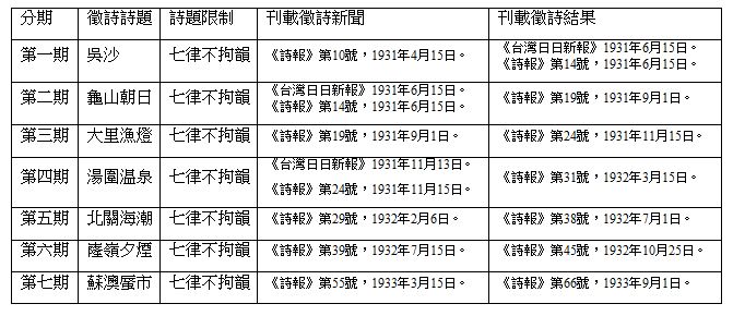 昭和6年(1931),登瀛吟社陸陸續續以具地方特色的詩題廣向全島徵詩,傳達推舉家鄉地景的地方認同意識,這些徵詩新聞及評審結果分別刊登在《台灣日日新報》、《詩報》,請參考附件一:登瀛吟社徵詩一覽表[4]