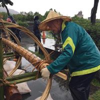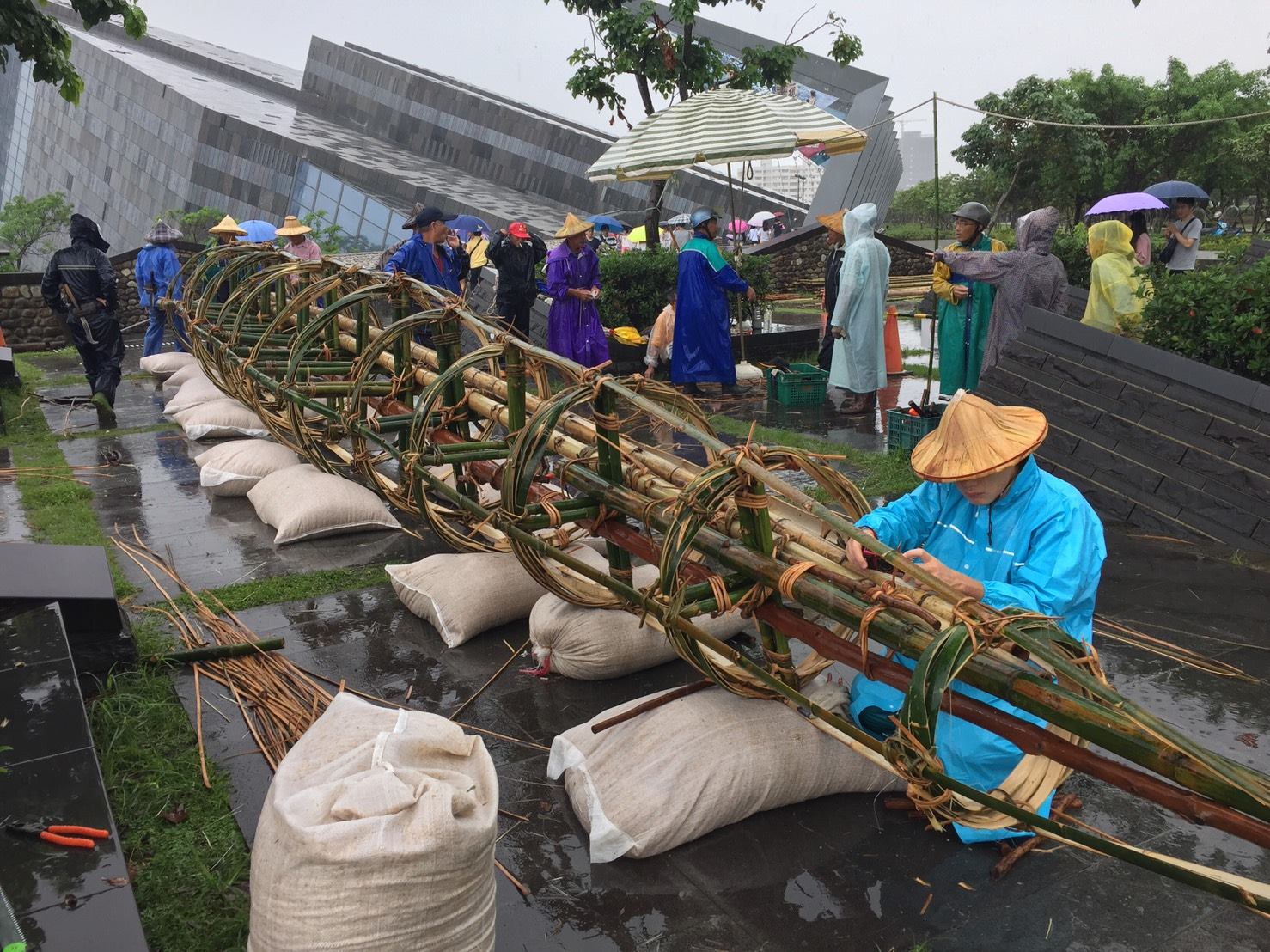 宜蘭開始下起大雨,到今天(9/2)上午不時有超大豪雨,一直很擔心會不會讓綁飯棧活動增添變數!沒想到林太源里長和下埔的耆老堅持要“照起工行”,照原定計畫進行,在風雨中剖竹子,整理籐條,再把修好的竹片,整理為圓筐,作為飯棧的骨架。一群60歲以上的老先生在大雨中專注地工作,是我們傳統技藝得以傳承的命脈!!