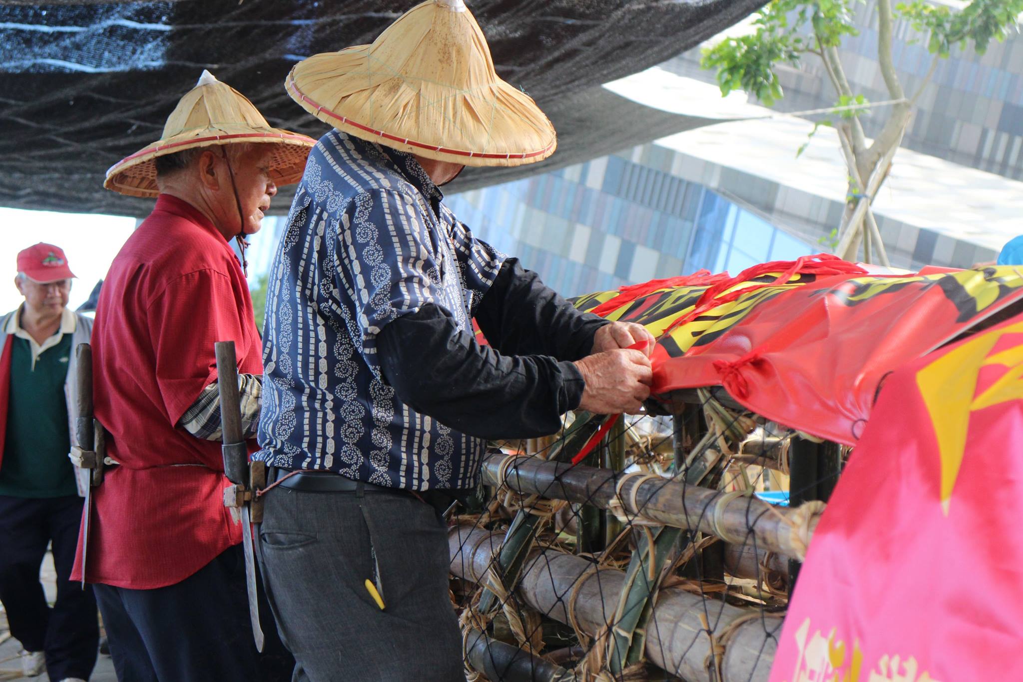依風俗禮儀信仰,祭典飯棧是有些禁忌必須遵守的,小編今天的照片都只能遠遠的拉鏡頭側拍了,今天的工作重點是把竹子整理成孤棧用的材料,先剖刀,再把每一片子修整,再依用途,做成支架或圓形,很多學員在體驗階段都做過一次了,現在熟練很多,黃昏時,形貌己然成形。光看照片不過癮吧!!還等什麼呢,只剩明後兩天可以看到如此精練的技藝囉!!